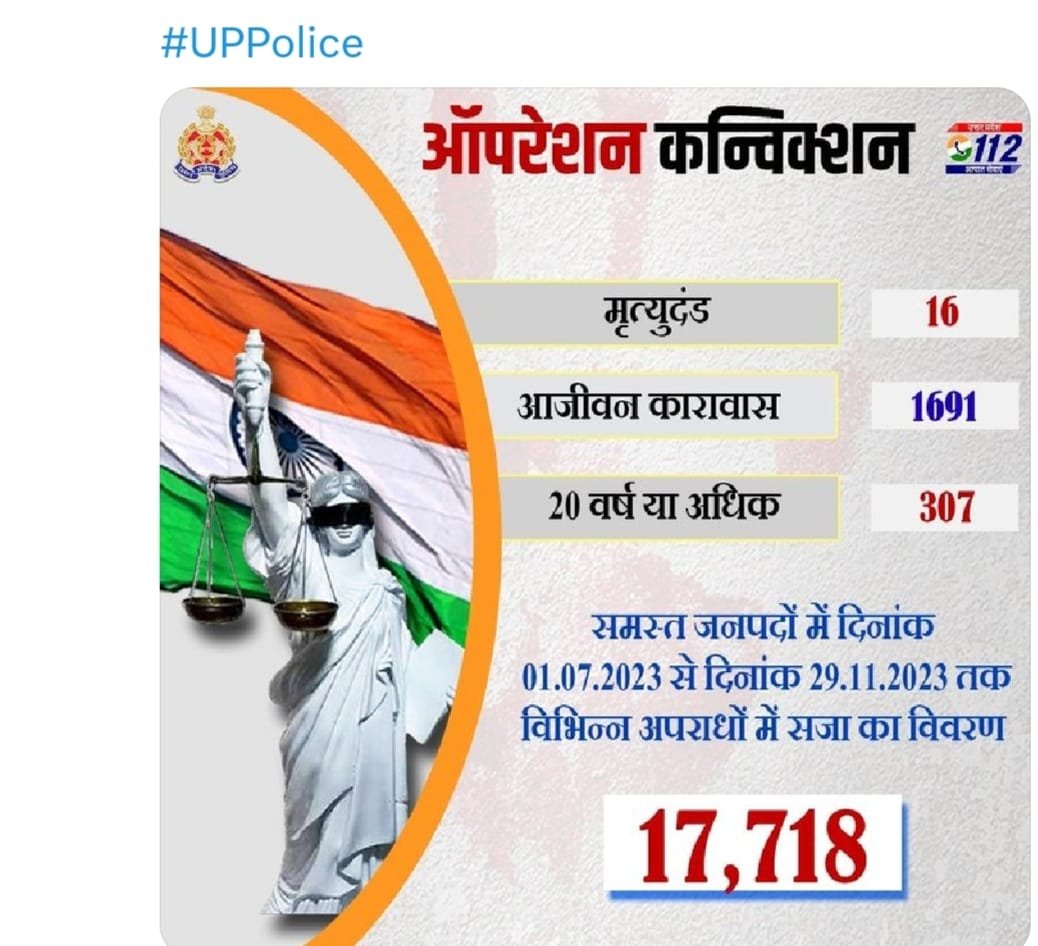 यूपी पुलिस की ओर से अपने ट्विटर एकाउंट पर प्रदेश भर में ऑपेरशन कन्विक्शन के तहत की कार्यवाही व अपराधियों को मिली सजा इस प्रकार है। यूपी के सभी जिलों में कुल 17 हजार 718 अपराधियों को सजा दिलवाई है। 1 जुलाई 2023 से 29 नवंबर 2023 तक आंकड़ा जारी किया है। इस बीच यूपी सरकार की पुलिस ने 18 लोगों को मृत्युदंड, 1691 लोगों को आजीवन कारावास और 307 लोगों पर 20 साल से अधिक की सजा दी गयी है।