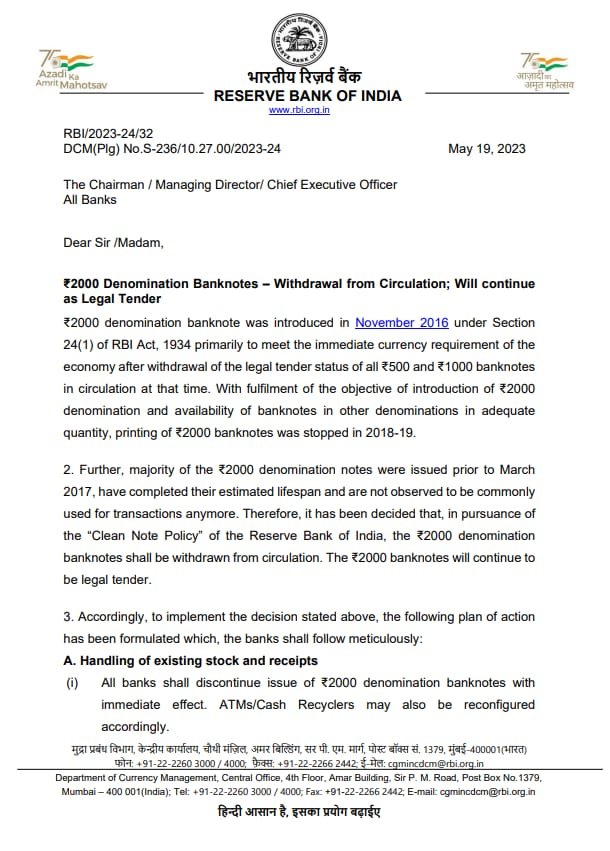 Agra. काफी समय से कयास लगा रहे थे कि 2000 का नोट भी जल्द बंद होगा। यह कयास अब सार्थक साबित हो चला है। भारतीय रिजर्व बैंक के अनुसार 2000 के नोट को सरकुलेशन से बाहर करने का निर्णय लिया है लेकिन अभी 2000 रुपये का नोट लीगल टेंडर बना रहेगा। इस संबंध में भारतीय रिजर्व बैंक ने देश के बैंकों को सलाह दी है कि 2000 रुपये के मूल्य के नोट को तत्काल प्रभाव से जारी करना बंद कर दिया जाए।