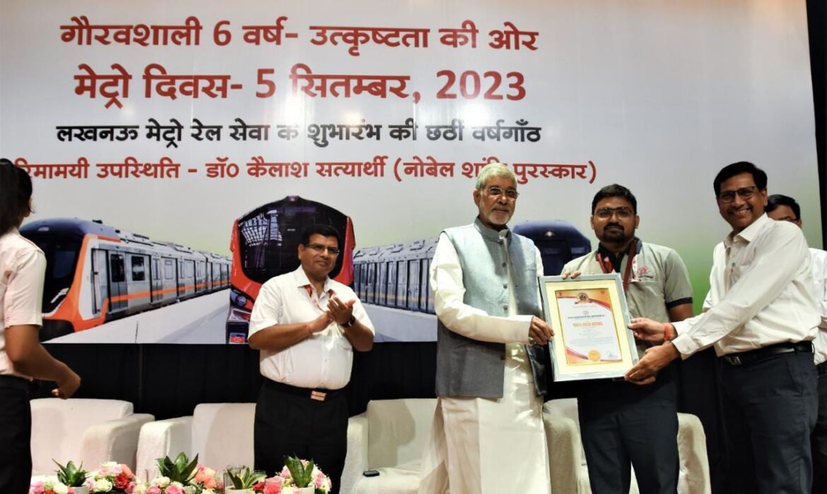 आगरा। उत्तर प्रदेश मेट्रो रेल कॉरपोरेशन द्वारा प्रदेश में मेट्रो सेवा के गौरवशाली 6 वर्ष पूर्ण होने पर 6वां ‘मेट्रो दिवस’ हर्षोल्लास के साथ मनाया। इस अवसर पर राजधानी लखनऊ में सांस्कृतिक कार्यक्रमों का आयोजन किया गया। इस कार्यक्रम में नोबेल शांति पुरस्कार विजेता डॉ. कैलाश सत्यार्थी मुख्य अतिथि रहे। वहीं, आगरा मेट्रो रेल परियोजना में उत्तम कार्य हेतु लिए सहायक अभियन्ता आनंद कुमार गुप्ता को स्वर्ण पदक से सम्मानित किया गया।