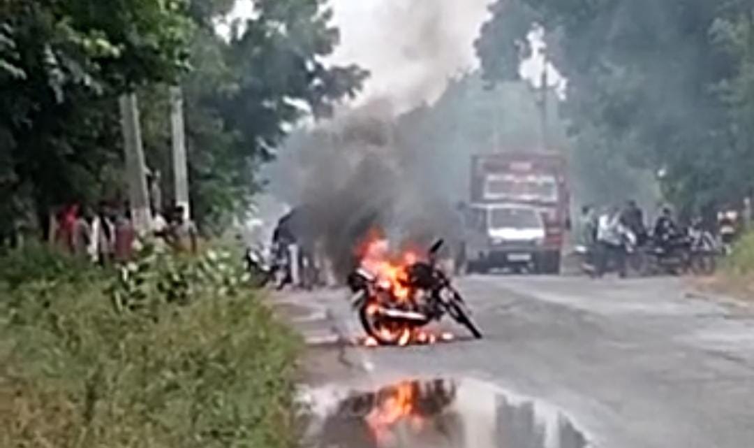 सड़क पर दौड़ती मोटरसाइकिल अचानक आग का गोला बन गई। मोटरसाइकिल पर साधु सवार थे। बताया जा रहा है कि मोटरसाइकिल में अचानक शार्ट सर्किट हुआ और इसके बाद आग लगने से सड़क पर दौड़ती मोटरसाइकिल आग का गोला बन गई। इस घटना के वीडियो सोशल मीडिया पर वायरल हो रहे हैं। वीडियो इरादत नगर थाना क्षेत्र के बताए गए हैं।