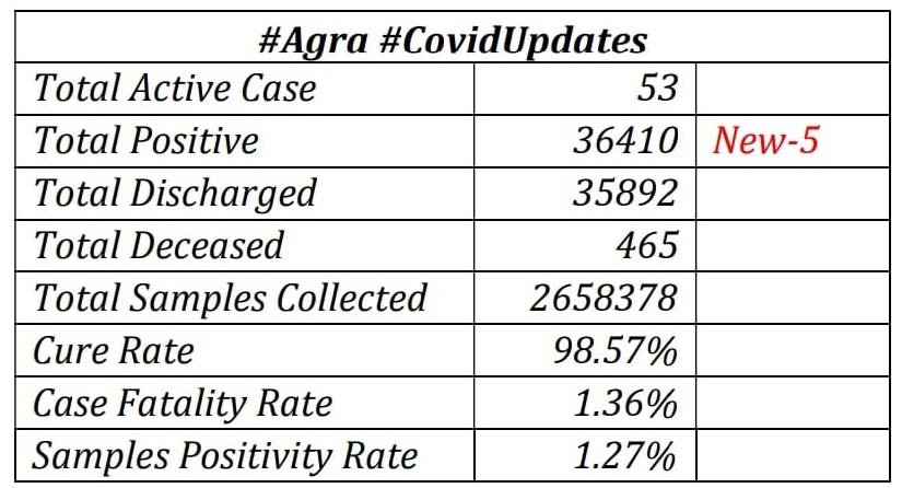 आगरा में कोरोना संक्रमण के मरीजों की संख्या में अब कमी आ रही हैं। शुक्रवार को कोविड 19 के मरीजों की संख्या कल के मुकाबले कम रही। हालांकि इसके बावजूद अभी भी 53 सक्रिय केस हैं। प्रशासन के आंकड़ों के अनुसार, आगरा में #Agra में पिछले 24 घन्टे में 2249 सैंपल लिए गए। इसमें पांच नए मरीज मिले। इसके अलावा 24 घंटे में छह मरीज भी स्वस्थ हुए हैं।#agranews