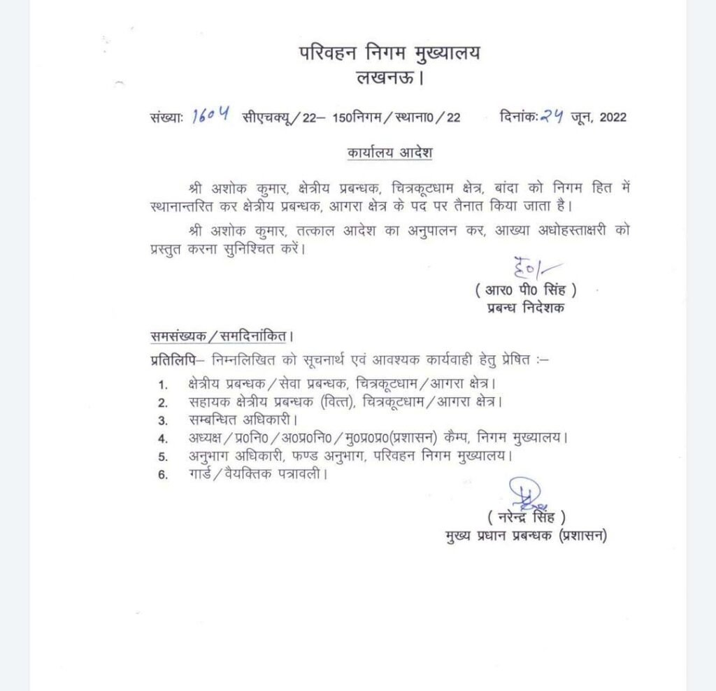 आगरा। आगरा रोडवेज के क्षेत्रीय प्रबंधक मनोज पुंडीर का आगरा से तबादला। उनके खिलाफ उत्तर प्रदेश रोडवेज एंप्लाइज यूनियन कई दिन से कर रहा था प्रदर्शन। 29 को थी बड़े आंदोलन की तैयारी।