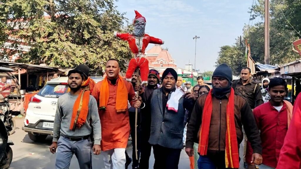 आगरा। क्रिसमस पर्व के पावन दिन पर हिंदूवादी संगठन बजरंज वाहिनी की ओर से क्रिसमस पर्व का विरोध किया गया। आगरा फोर्ट स्टेशन के सामने बजरंज वाहिनी के कार्यकर्ताओं ने हाथों में ‘सेंटा क्लॉज़ का पुतला लेकर ‘सेंटा क्लॉज़ हाय हाय, सैंटा क्लॉज वापस जाओ, जय श्री राम जय हिंदू राष्ट्र’ के नारेबाजी कर रहे थे। जैसे ही हिंदूवादी संगठन बजरंज वाहिनी के कार्यकर्ता सेंटा क्लॉज़ के पुतले का दहन करने के लिए बढ़े। तभी पुलिस मौके पर पहुँच गयी। पुलिस ने पुतला छीनने का प्रयास किया।