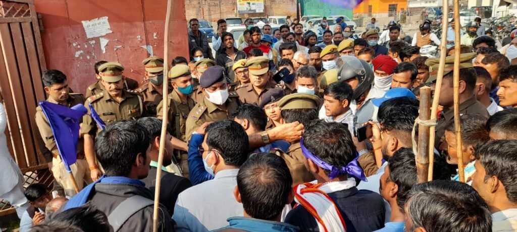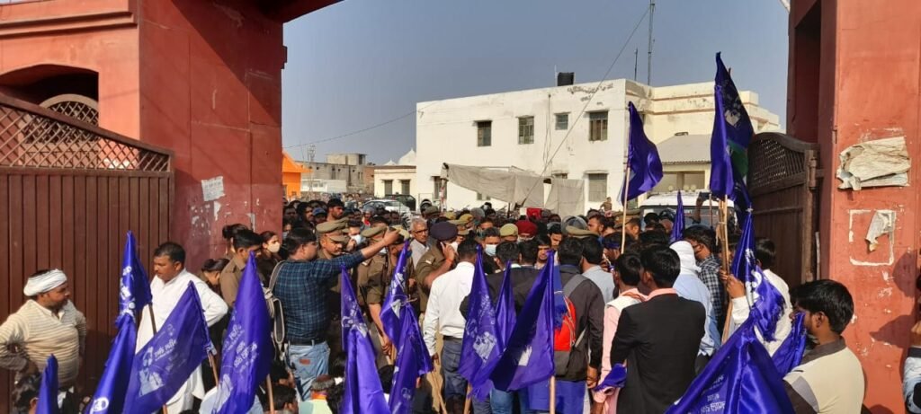 आगरा। भीमराव आंबेडकर की प्रतिमा क्षतिग्रस्त होने वाले मामले में अभी-अभी भीम आर्मी के कार्यकर्ताओं ने जिला मुख्यालय पर धरना दे दिया है। बड़ी संख्या में कार्यकर्ता जिला मुख्यालय के गेट पर बैठ गए हैं, जिससे जिला मुख्यालय परिसर का रास्ता बंद हो गया है। अधिकारी उन्हें समझाने में लगे हुए हैं। इसी बीच सीओ और भीम आर्मी कार्यकर्ताओं के बीच जबरदस्त हॉट टॉक हुई है।
