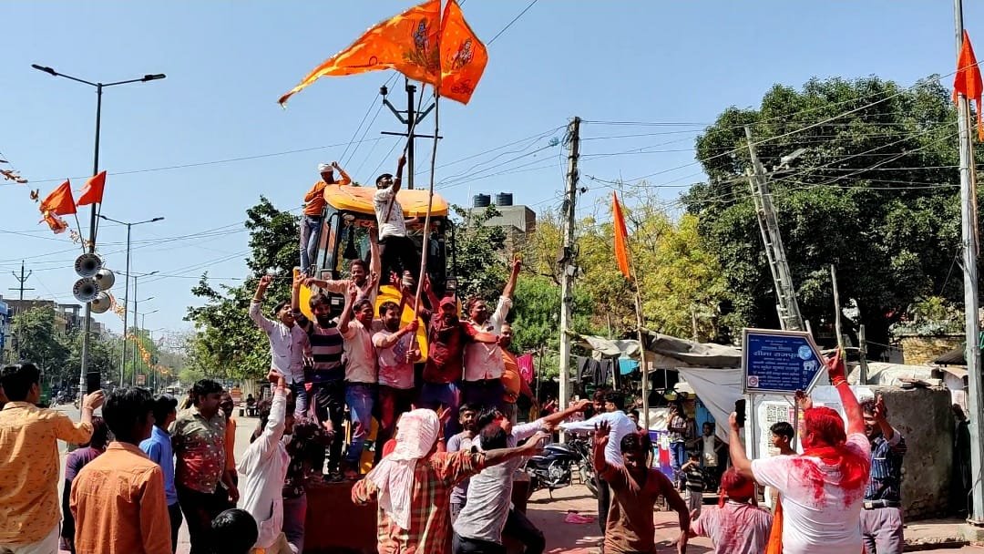 Agra. भारतीय जनता पार्टी को प्रचंड बहुमत से मिली जीत के बाद भारतीय जनता पार्टी के कार्यकर्ताओं का जश्न मनाने का दौर थमने का नाम नहीं ले रहा है। आगरा जिले में 9 की 9 विधानसभा सीटों पर भाजपा का कब्जा होने से यह खुशी उनके लिए दुगनी हो गई है। इस खुशी को वह बुलडोजर के साथ मना रहे हैं लेकिन अब जश्न मनाने के लिए बुलडोजर भी नहीं मिल रहे हैं। ऐसा ही कुछ नजारा सुलतानपुरा चौराहे पर देखने को मिला बजरंग दल के गौ रक्षा प्रकोष्ठ के महानगर प्रमुख अनूप पंडित की ओर से चौराहे पर भाजपा की जीत का जश्न मनाया गया। बुलडोजर पर चढ़कर भगवा लहराया और एक दूसरे को भाजपा की जीत की बधाई दी।