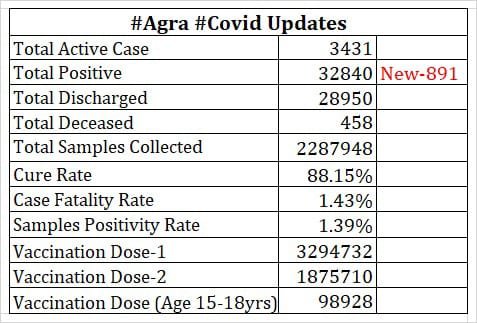 प्रशासन द्वारा जारी की गई रिपोर्ट के मुताबिक अभी तक आगरा शहर में कोरोना महामारी में कुल 32840 लोग कोरोना से संक्रमित हो चुके हैं जिसमें से 28950 लोग ठीक हो चुके हैं जबकि 458 लोगों की मौत हो चुकी है। वहीं आगरा शहर में 15 से 18 साल की उम्र से युवाओं को तेजी से वैक्सीनेशन किया जा रहा है। अभी तक 98928 युवाओं को वैक्सीन लगाई जा चुकी है।