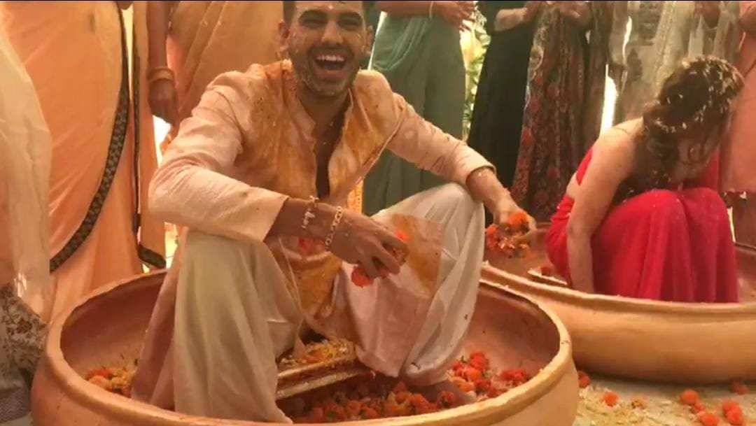 हल्दी की रस्म के दौरान जहां दीपक चाहर ने सफेद रंग का डिजाइनर कुर्ता पजामा पहना हुआ था तो वहीं जया भारद्वाज लाल रंग के आकर्षक परिधान में बेहद खूबसूरत लग रही थीं। दीपक चाहर और जया दोनों एक बड़े पॉट में बैठे हुए थे। उनके दोस्तों और रिश्तेदारों ने दीपक और जया को जमकर हल्दी लगाई। इस दौरान वहां डीजे पर बज रहे पंजाबी गाने पर दीपक हंसते खिलखिलाते मस्ती के मूड में नजर आए तो वहीँ जया भी इस मस्ती में उनका भरपूर साथ दे रही थीं।