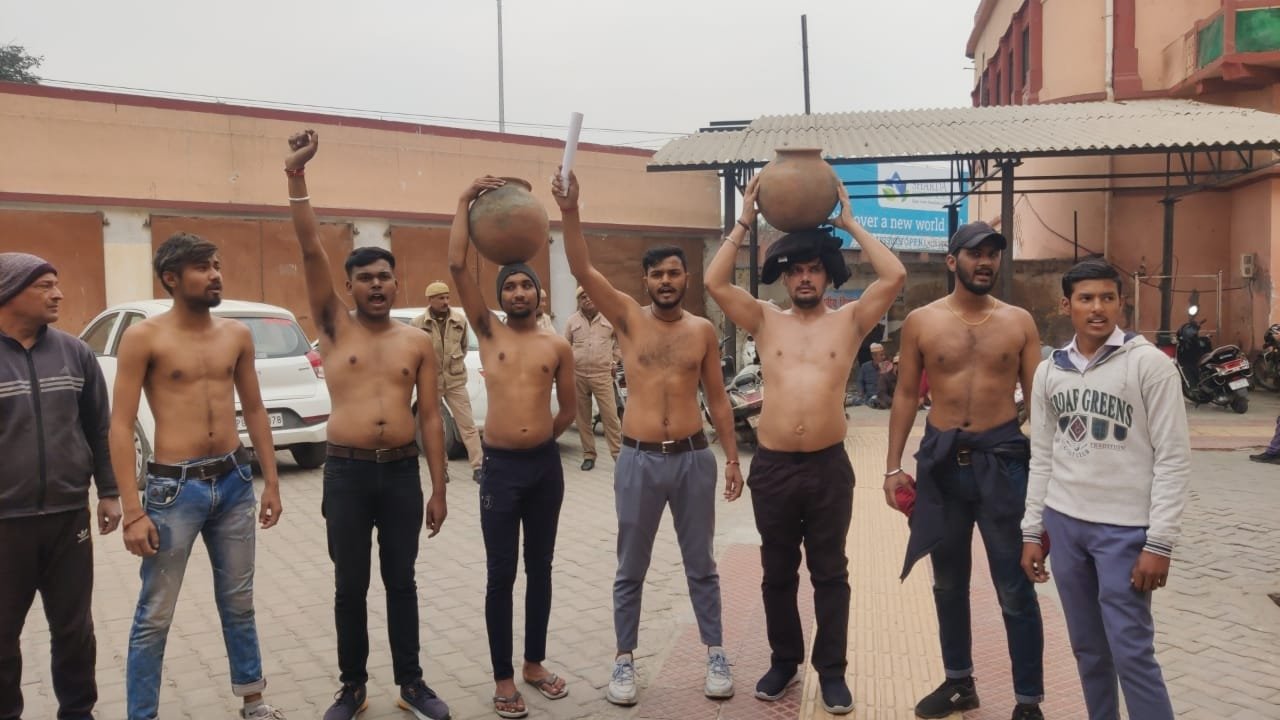 सौरभ चौधरी के नेतृत्व में दयालबाग से पहुंचे लोगों ने सिर पर खाली मटका रखकर अर्धनग्न अवस्था में जिला मुख्यालय में प्रदर्शन किया। सौरभ चौधरी ने कहा कि वह पिछले 4 साल से अपने क्षेत्र में गंगाजल की लाइन बिछवाने के लिए दर दर भटक रहा है। लेकिन कोई सुनवाई नहीं हो रही है। इसी से आक्रोशित होकर एक बार फिर वह जिला मुख्यालय पर ज्ञापन देने आए हैं कि जो अधूरा काम है उस काम को जल्द से जल्द पूरा कराया जाए।