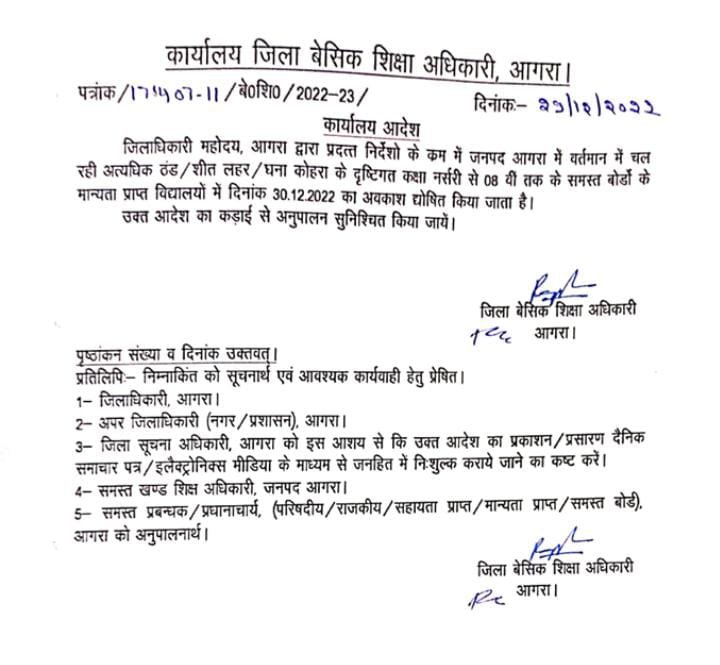 शीतलहर और घना कोहरा को देखते हुए नर्सरी से लेकर कक्षा 8वीं तक की छुट्टियों को आगरा जिलाधिकारी ने एक दिन के लिए और बढ़ा दिया है। यानी 30 दिसंबर को भी कक्षा 8वीं तक के बच्चों की छुट्टी रहेगी।