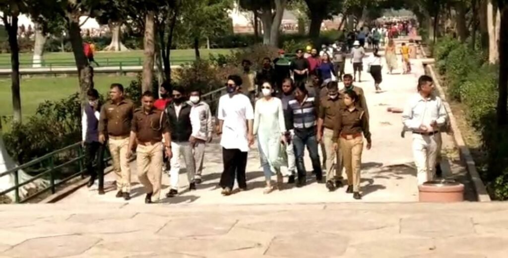 Agra. मोहब्बत की निशानी ताजमहल का दीदार करने के लिये रविवार को फिल्म अभिनेत्री रकुल प्रीत सिंह आगरा पहुँची। उन्होंने फिल्म प्रड्यूसर जैकी भगनानी के साथ ताजमहल का दीदार किया। ताजमहल भ्रमण के दौरान उनके साथ सीआईएसएफ और पुलिस अधिकारी भी मौजूद रहे जिनकी सुरक्षा घेरे में है अभिनेत्री रकुल प्रीत और प्रोड्यूसर जैकी भगनानी ने ताजमहल का दीदार किया।