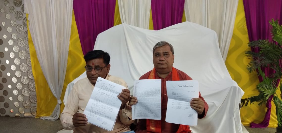 समाजसेवी व आगरा के बोर्ड ऑफ ट्रस्टीज के सदस्य सुभाष ढ़ल व सुनील करमचंदानी ने आज भगवान सिनेमा चैराहा स्थित होटल आशादीप में प्रेस वार्ता आयोजित कर डॉ. अनुराग शुक्ला पर मुकद्मा दर्ज करने की मांग की। बताया कि प्राचार्यों की चयनित सूची में पहला स्थान पाये डॉ अनुराग शुक्ला ने 2021 में आगरा कॉलेज ज्वाइन किया पर उस समय भी उनके द्वारा नियमानुसार अपने चयन में लगाये गये सभी शैक्षणिक दस्तावेजों एवं अनुभव प्रमाण पत्र नियोक्ता संस्था आगरा कॉलेज प्रबंध समिति के समक्ष नहीं प्रस्तुत किए गए। जब गंभीर वित्तीय एवं प्रशासनिक अनियमितताओं में संलिप्त होने के कारण था आगरा कॉलेज जैसे प्रतिष्ठित संस्था के प्रशासन में अक्षमताएँ सामने आई तो शासन और प्रबंध समिति द्वारा इनका पक्ष सुनते हुए जाँच कराई गई और इनमें घोर अनियमिताएँ पाई गई शासन ने इन्हें निलंबित कर विस्तृत जाँच कराने का निर्णय लिया और उसी के अनुरूप प्रबंध समिति अध्यक्ष ने संस्था हित में इन्हें निलंबित किया।