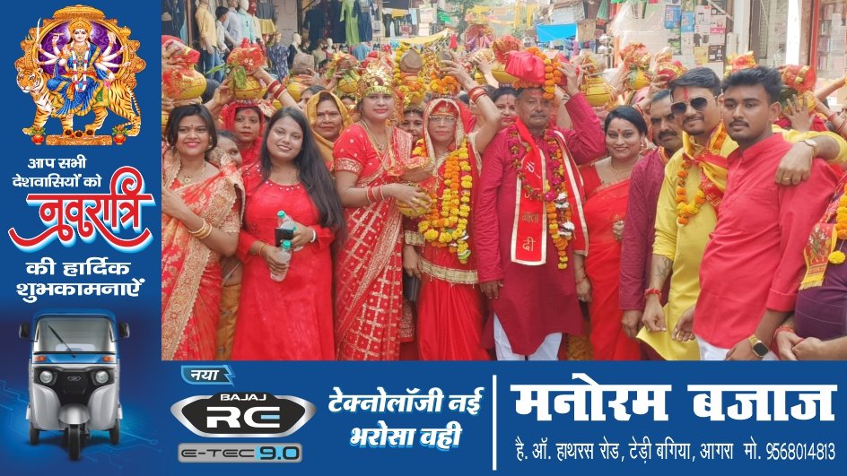 आगरा। श्री गिरिधर नगर, ट्रांस यमुना कॉलोनी फेस 1 स्थित श्री मां राजेश्वरी कैला देवी मंदिर पर 15 अक्टूबर से 23 अक्टूबर तक श्रीमद्भागवत कथा का आयोजन किया जा रहा है। जिसके पहले दिन आज रविवार को यमुना पार क्षेत्र में भव्य कलश यात्रा निकाली गयी। कलश यात्रा में शामिल महिलाओं ने 151 कलश सिर पर धारण किये तो वहीँ मंदिर के संस्थापक व आयोजनकर्ता पदम सिंह सिकरवार एवं धर्मपत्नी शंकुतला सिकरवार अपने सिर पर श्रीमद्भागवत को धारण कर सबसे आगे चलते हुए क्षेत्रवासियों को कथा में शामिल होने का निमंत्रण दे रहे थे।