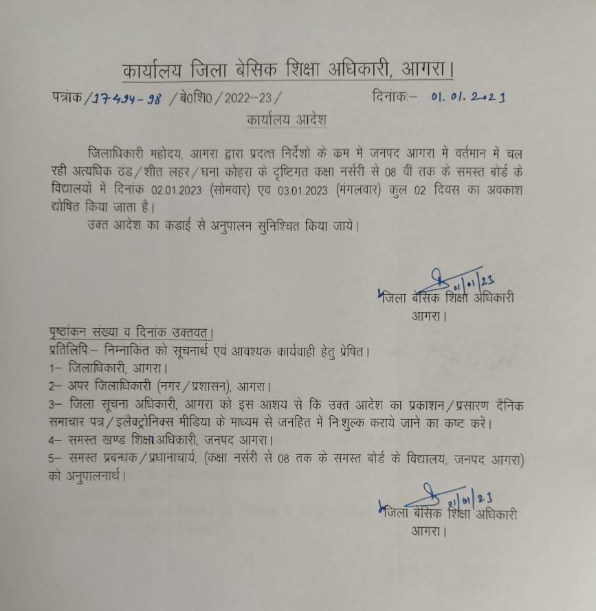 आगरा जिला अधिकारी ने आदेश जारी करते हुए कक्षा नर्सरी से लेकर आठवीं तक के सभी स्कूलों में अवकाश घोषित कर दिया है। सभी बोर्ड के मान्यता प्राप्त स्कूलों में छुट्टी का यह आदेश प्रभावी होगा। वहीं कक्षा 9वीं से लेकर कक्षा बारहवीं तक के स्कूल का संचालन का समय प्रातः 10:00 बजे से अपराहन 3:00 बजे तक रहेगा।