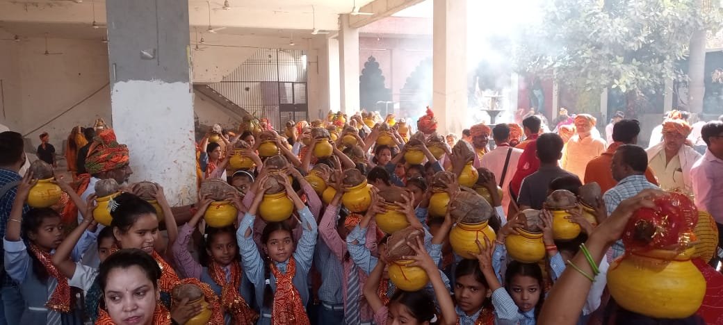 प्रख्यात कथा व्यास आचार्य श्री रामनजर जी महाराज (पूज्य श्रीहरि जी महाराज) के सानिध्य में प्राचीन राजेश्वर मंदिर में सर्वप्रथम पूर्व विधायक मधुसूदन शर्मा एवं परीक्षित विनोद शर्मा ने राजेश्वर भगवान एवं भागवत पूजन के साथ सरस कथा व्यास आचार्य हरिओम जी महाराज का पूजन किया। विद्वान ब्राह्मणों ने वेद मंत्रों का उच्चारण किया। इसके बाद 551 महिलाएं पीली साड़ी पहनकर राजेश्वर मंदिर से कलश लेकर चली।