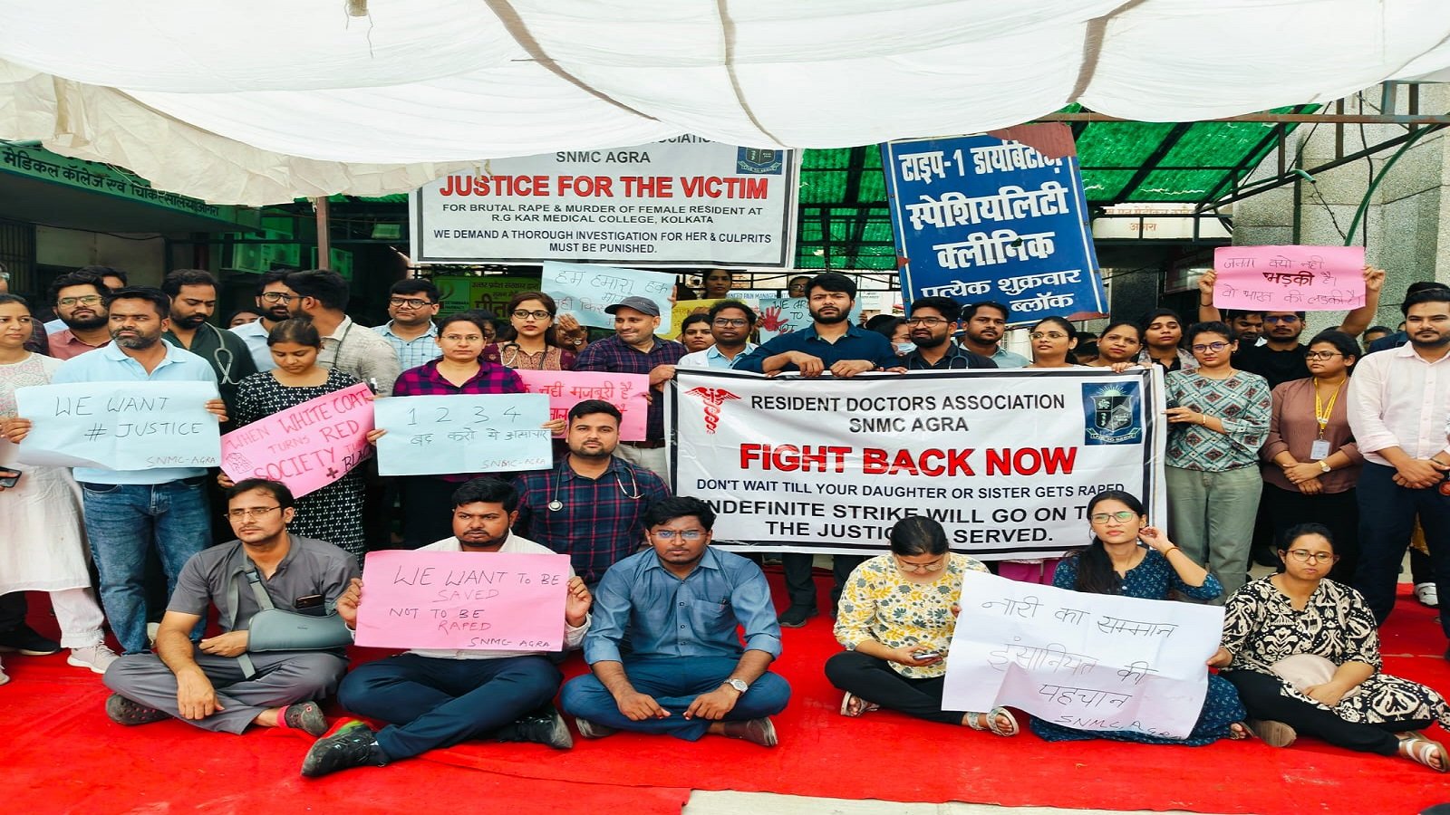 आगरा। कोलकाता में महिला डॉक्टर के साथ रेप और फिर उसकी हत्या से देशभर के चिकित्सकों में नाराजगी देखने को मिल रही है। देशभर के सरकारी हॉस्पिटलों में जूनियर डॉक्टर हड़ताल पर चले गए हैं। ऐसा ही नजारा आगरा के एसएन अस्पताल में देखने को मिल रहा है। आगरा के एसएन अस्पताल के जूनियर डॉक्टर हड़ताल पर चले गए हैं और पश्चिम बंगाल सरकार के खिलाफ जमकर प्रदर्शन कर रहे हैं। उन्होंने दो टूक शब्दों में कहा है कि जब तक मृतक महिला चिकित्सक को इंसाफ नहीं मिलेगा प्रदर्शन जारी रहेगा।