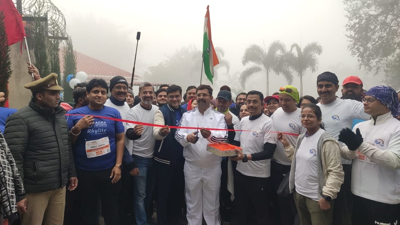 आगरा। हाथों में तिरंगा लिए कोहरे की धुंध को चीरते हुए दौड़ते सैकड़ों धावक। उत्साहवर्धन के लिए ढोल नगाड़ों का संगीत। कुछ ऐसा ही नजारा था आज खेलगांव में। जहां आगरा स्पोर्ट्स फाउंडेशन द्वारा 3 मार्च को ताजनगरी में पहली बार आयोजित होने जा रही हाफ मैराथन के 5 किमी के फर्स्ट प्रोमो का आयोजन किया गया। प्रतियोगिता के भाव से अधिक मन में कटऑफ टाइम (एक घंटा) के अन्दर दौड़ को पूरा करने की इच्छा नजर आई धावकों में। कार्यक्रम का शुभारम्भ फीता काटकर व हरी झंडी दिखाकर मुख्य अतिथि एडीशनल कमिश्नर केशव कुमार चौधरी व विशिष्ठ अतिथि एसएन मेडिकल कालेज के प्राचार्य डॉ. प्रशान्त गुप्ता ने किया।