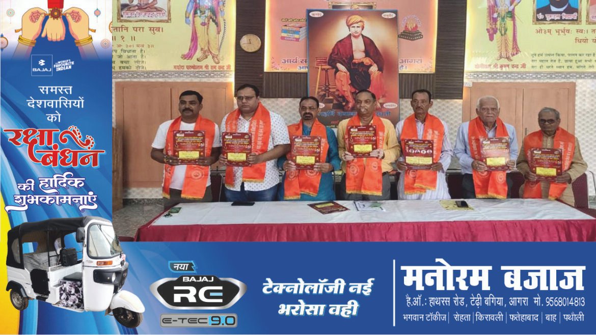 यह जानकारी आर्य समाज आगरा नगर फ्रीगंज के प्रधान बृजराज सिंह परमार ने आर्य समाज मंदिर में आयोजित पोस्टर विमोचन कार्यक्रम में दी। बताया कि भारत भूषण से सम्मानित मेरठ के प्रवक्ता आचार्य डॉ. कपिल मलिक, वैदिक प्रवक्ता आचार्य दत्तात्रेय, भजनोपदेशिका बहन कल्याणी आर्या, यज्ञब्रह्मा आचार्य सोमप्रकाश शास्त्री होंगे। 7 सितम्बर को श्रीकष्ण जन्माष्टमी मनायी जाएगी। जिसमें सभी समाज व धर्म के लोग उपस्थित रहेंगे।