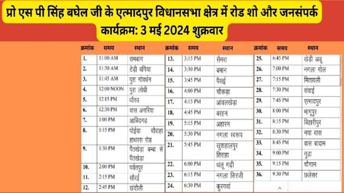 शुक्रवार को प्रातः 11 बजे शहरी क्षेत्र रामबाग से विधानसभा में रोड शो का शुभारंभ करेंगे। इसके बाद टेढ़ी बगिया, पुरा गोवर्धन, पुरा लोधी, धौरऊ, बास अगरिया, अबिदगढ़, पोइया, पैतखेड़ा, पर्वतपुर सोरई, खंदौली, सेमरा, बमान, पैसई, चोकड़ा, बरहन, अहारन, नगला स्वरूप खुशालपुर, थलुगडी, नगला सिरजी, कुरगवा, खेडीअडू नगला गोल, मितावली, सवाई, एत्मादपुर, भागुपुर, बिहारीपुर, नया बांस, बास बादाम गुढ़ा, चौगान, छलेसर इत्यादि क्षेत्रों में रोड शो जनसंपर्क और देर रात्रि तक चुनावी नुक्कड़ सभाओं को संबोधित करेंगे।