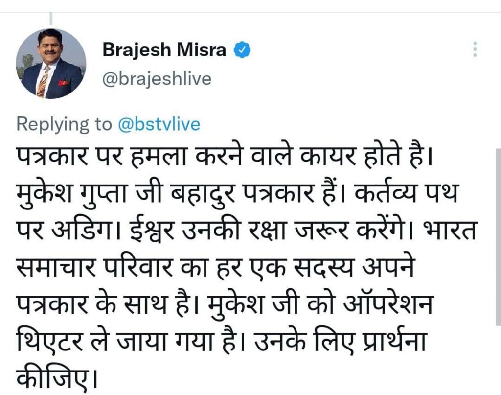 इधर भारत समाचार के संपादक बृजेश मिश्रा ने ट्वीट किया है। उन्होंने कहा है कि पत्रकार पर हमला करने वाले कायर होते हैं।