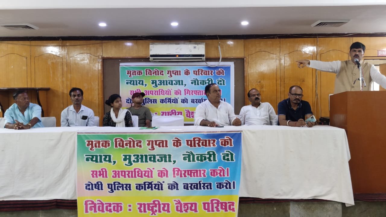 कार्यकारी अध्यक्ष विनय अग्रवाल ने कहा कि पुलिस प्रशासन के सामने नाम देने के बाद भी कार्रवाही न हो तो कोई भी समाज हो आंदोलित होगा। अपराधी पुलिस कर्मी लाइन हाजिर नहीं जेल में होने चाहिए। वहीं विनोद गुप्ता के उत्पीड़न के चश्मदीद पार्षद हरिओम ने कहा कि जो राजेश चौहान पुलिस के सामने मुझे और विनोद को जान से मारने की बात कह रहा था आखिर अचानक 28 जुलाई को समझौते के लिए मुझे क्यों फोन करने लगा। सब साक्ष्य होने के बाद भी अपराधी खुले घूम रहे हैं। ऐसा नहीं चलेगा। पदाधिकारियों ने वैश्य समाज से 7 व 10 अगस्त को एकजुट होकर आंदोलन में शामिल होने की अपील की। संचालन उमेश अग्रवाल ने किया।