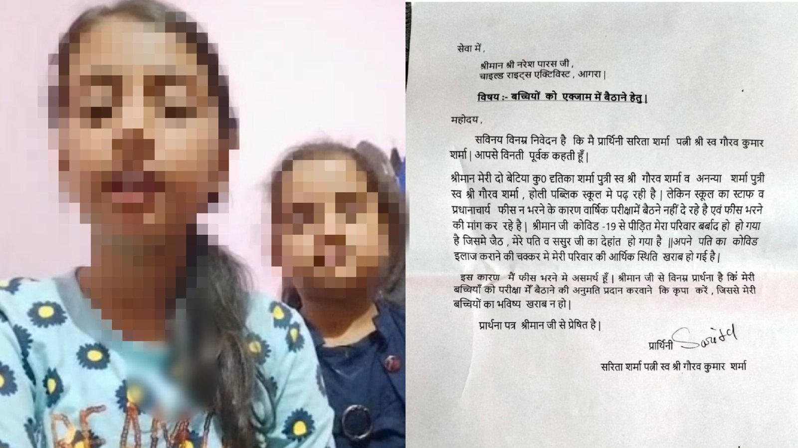 आगरा के आवास विकास कालोनी के सेक्टर 12 डी निवासी सरिता देवी के पति गौरव शर्मा और उनके जेठ व ससुर कोरोना काल में काल के गाल में समा गए थे। इलाज में अपना सब कुछ लुटा देने के बाद भी वो तीनों को नहीं बचा पाई। परिवार में कमाने वाला कोई नहीं बचा है और आर्थिक स्थिति बहुत खराब हो गई है। सरिता की दो बेटियां दुतिका शर्मा और अनन्या शर्मा आवास विकास सेक्टर चार स्थित होली पब्लिक स्कूल में पढ़ती हैं। आर्थिक तंगी के चलते वो बच्चियों की फीस नहीं भर पाई थीं। इस कारण स्कूल प्रबंधन बच्चियों को परीक्षा में नहीं शामिल होने दे रहा है।
